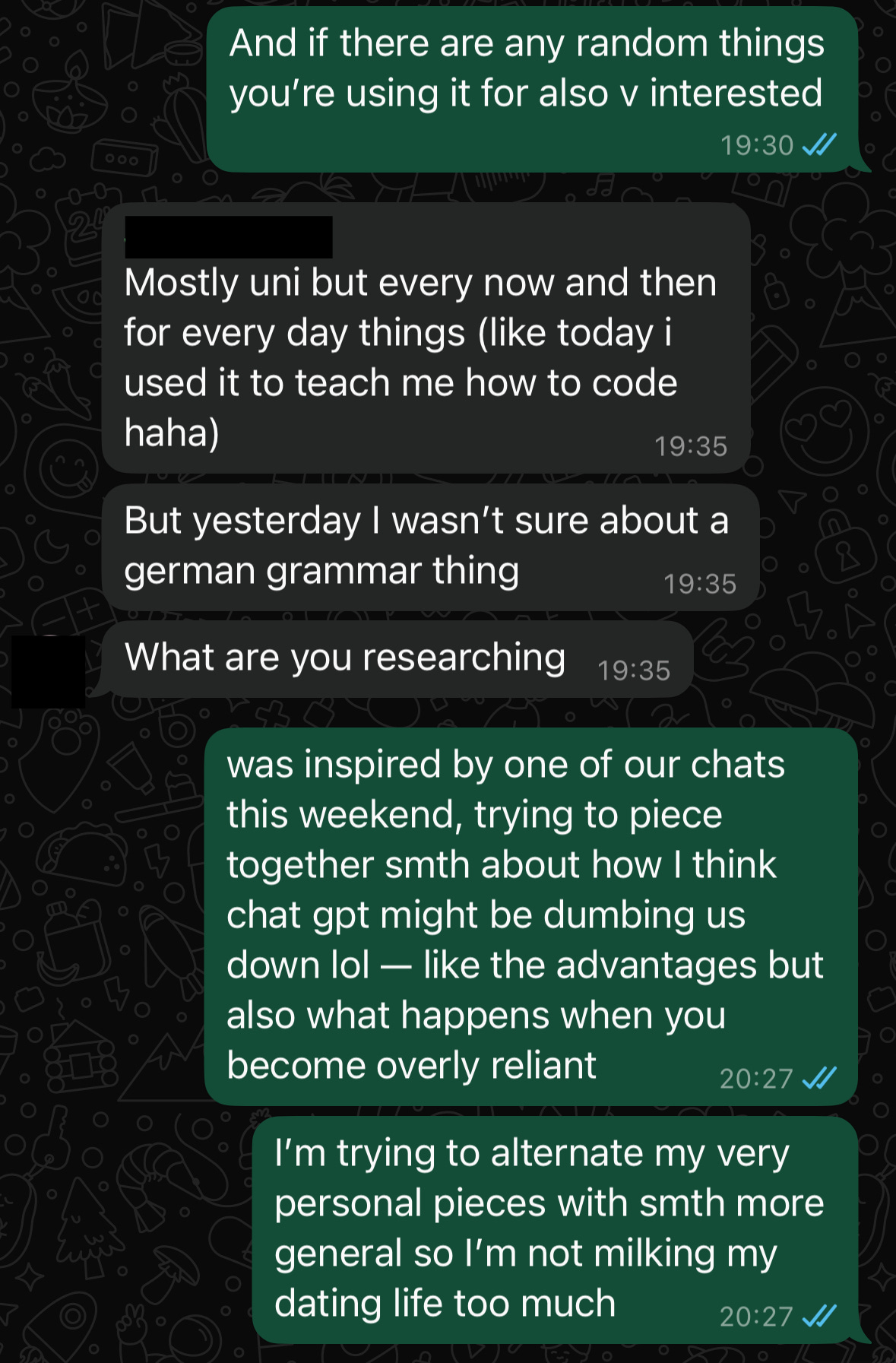 I’m not sure I’m making a lot of sense here, as I was trying to piece this essay together, I found myself going around in circles. I figured I’d phone a friend and try to understand how other people were using AI. I don’t think I’d make my Research Methods professor very proud here, but in an effort to get some quick responses, I shot off a couple of questions in a few group chats. Now onto the results: my friends fell all over the AI-usage scale, with some using it daily for work and uni tasks, checking grammar and even asking Chat GPT for recipe and workout inspiration, whilst others only occasionally resorted to asking for tech support. One of my friends then texted me separately and admitted: