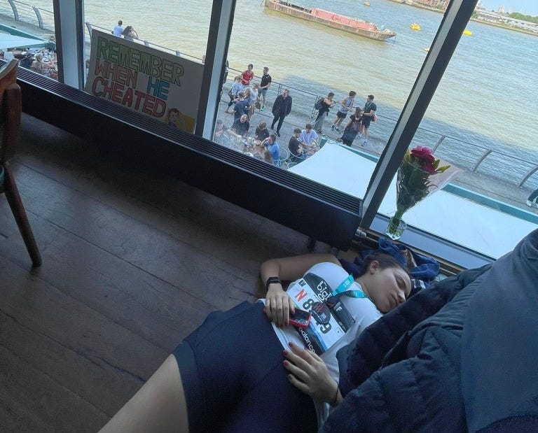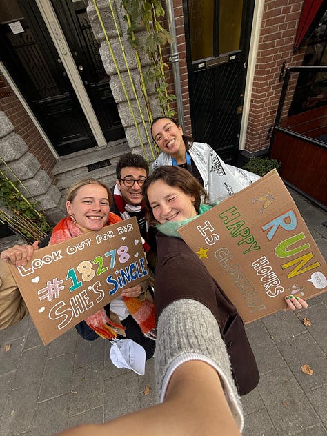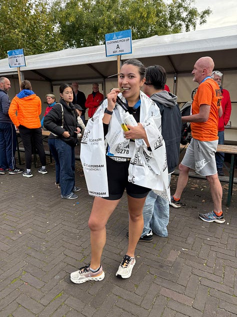 Growing up, I despised running; I would come up with ridiculous excuses to avoid running the mile all throughout middle school1. In the spring of 2020, something changed. Stuck at home, I figured I would give it another go. I had tried to get into running before, but it never stuck for more than a week. I took any excuse to get out of the house, and as someone who lacked the focus or discipline to get through a Chloe Ting ab video, running was the perfect solution. No matter how tired or bored I got, I still had to get home somehow. I worked my way up to a 5k, and whenever the runner’s high hit I’d say that one day I wanted to run a marathon. It felt like a distant goal, something for my future self to tick off a list before turning thirty. After running a couple of half-marathons, I realised that I needed the pressure of a looming race to get me to hit the pavement. With more and more people around me running marathons, it suddenly seemed more achievable2. I told myself, what’s five hours of pain for a lifetime of clout?3 Last year, when I was riding the high of running my second half4, I made the endorphin-fuelled decision to sign up for the Amsterdam Marathon. I loved the idea of doing something that was just for myself. Throughout the course of my training, I’d tell my friends that I wasn’t taking things “too seriously.” It was maybe not the fairest assessment, but when I saw people uphauling their entire lives to optimise performance with routines that rivalled those of professional athletes, I felt like my casual-paced runs fuelled by entire bags of Skittles paled in comparison. I didn’t follow elaborate fuelling strategies, splurge on carbon-plated shoes, or decline invites to the pub. I felt like a bit of a fraud. I avoided talking about running altogether (and if you’ve ever met anyone who’s training for a marathon, you know how we love the attention) because I felt like I didn’t quite fit the profile. I wasn’t going into this with any time goals and expectations. My only focus was enjoying myself and trying to get through the next four months without hating running in the process.