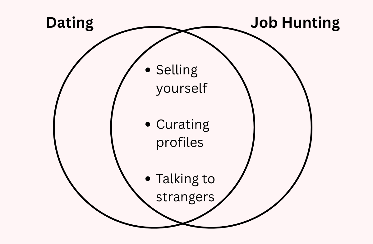 They say it takes 10,000 hours to become an expert on something, and though I’m yet to hit quadruple digits, I’ve definitely put my time in for both job and relationship applications. I’ve pored over every detail on my resume and gotten feedback from friends and industry professionals. In a similar vein, once deciding to hop back on the apps, what was meant to be a chill night in with my girlfriends turned into a group project as we curated the perfect profile over (several) bottles of wine (the risks of being the designated experimental single friend). I have since become an expert at cover letters and opening lines alike. I’ve had multiple first dates and interviews in the past six months, and have quickly realised that both require a degree of curation, a level of editing and a commitment to selling yourself. You have to find the balance of being interested enough without looking desperate, I have said of both texting back your most recent match on Hinge and getting back to a recruiter. It’s gotten to the point where I’m worried that being single and unemployed has become my personal brand, and I need to branch out before I get a job and a man and have nothing else to write about.